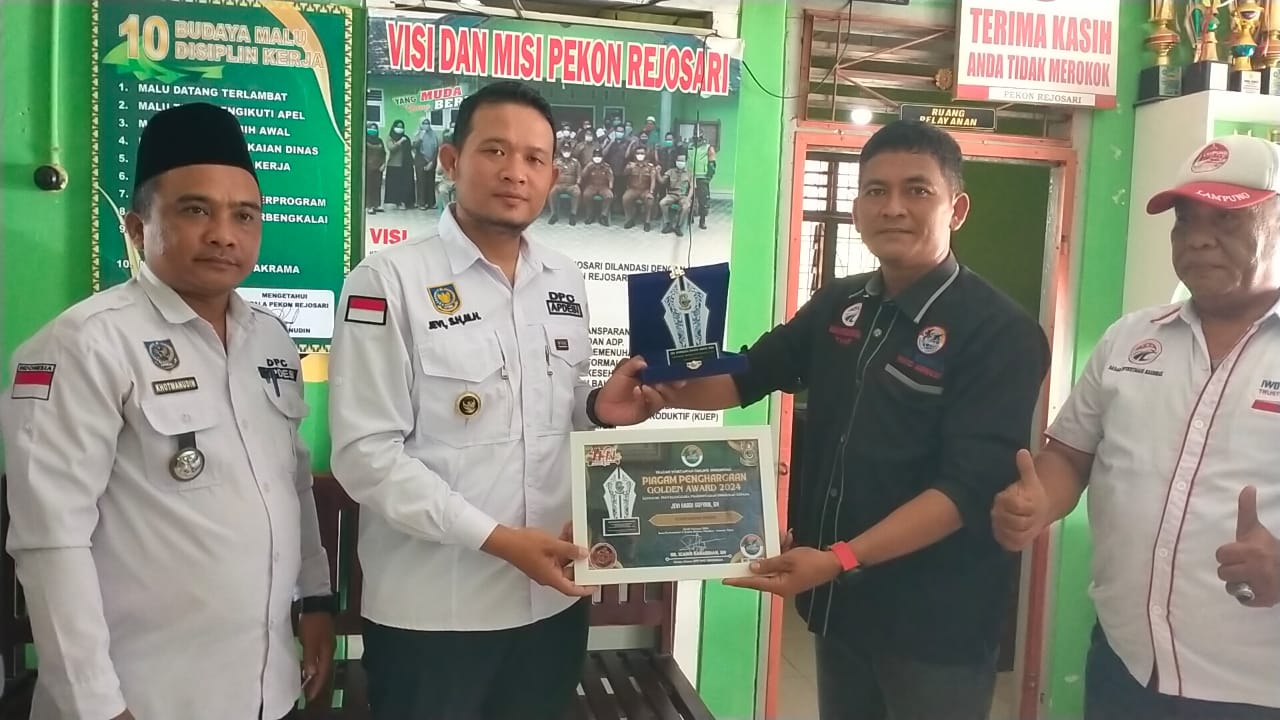 Tiem IWO -I Pringsewu Menyerahkan Plakat dan Piagam Golden Award Kepada Ketua Apdesi kabupaten Pringsewu Jevi .SH.MH .Di Balai Pekon Rejo Sari hari Kamis 21/03/2024 .