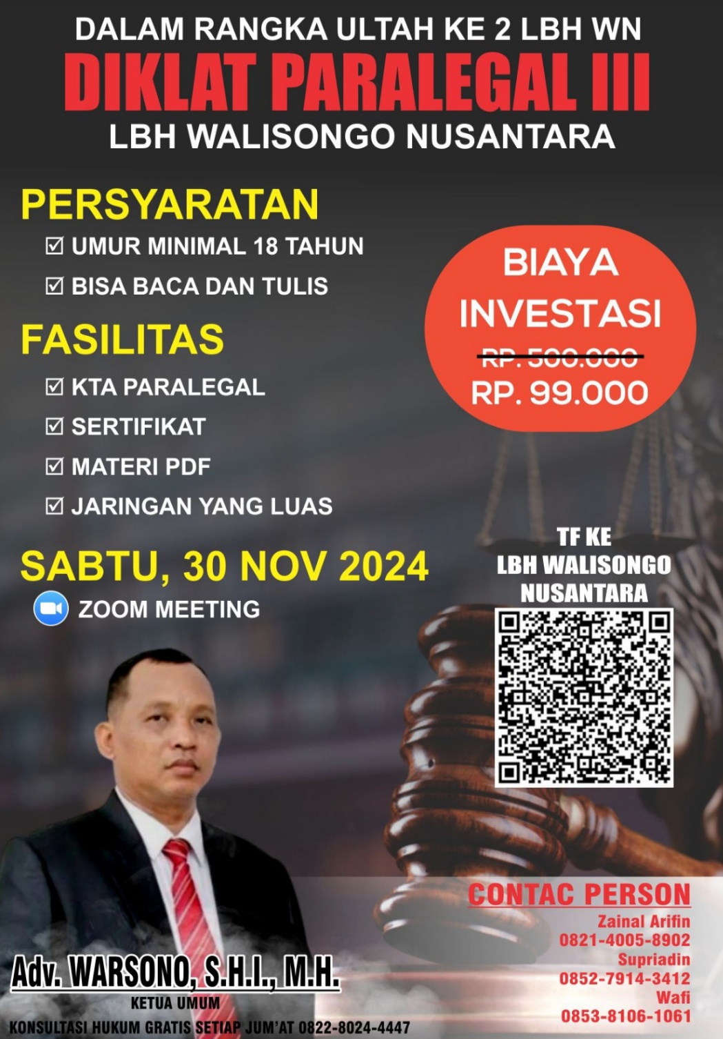 Segera daftarkan diri anda diacara paralegal III yayasan lbh wali songo nusantara.kesempatan yang bagus ini dalam bidang hukum dan paralegal jangan sampai terlewatkan kesempatan yang bagus dan benefit yang luar biasa.