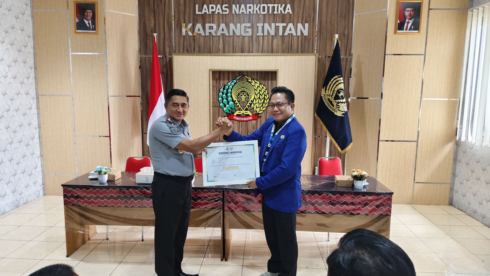 Sertifikat akreditasi diserahkan Ketua Lafkespri Wilayah Kalimantan Selatan, Fahriadi, kepada Kepala Lapas, Edi Mulyono. Fahriadi atas nama mengucapkan selamat atas capaian yang didapat Klinik Pratama Lapas Narkotika Karang Intan.