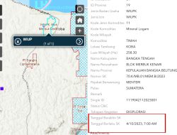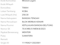 Sementara itu, dalam laman geoportal esdm media menemukan fakta menarik soal status kawasan Blok Merbuk Kenari pada Minggu pagi 29 Juni 2025. Area penambangan timah eks KOBATIN dengan nomor kontrak SK 70.Κ/ΜΒ.01/ΜΕΜ.Β/2023 dinyatakan telah berakhir masa berlaku kontraknya pada 4 Oktober 2023 jam 7:00 am.