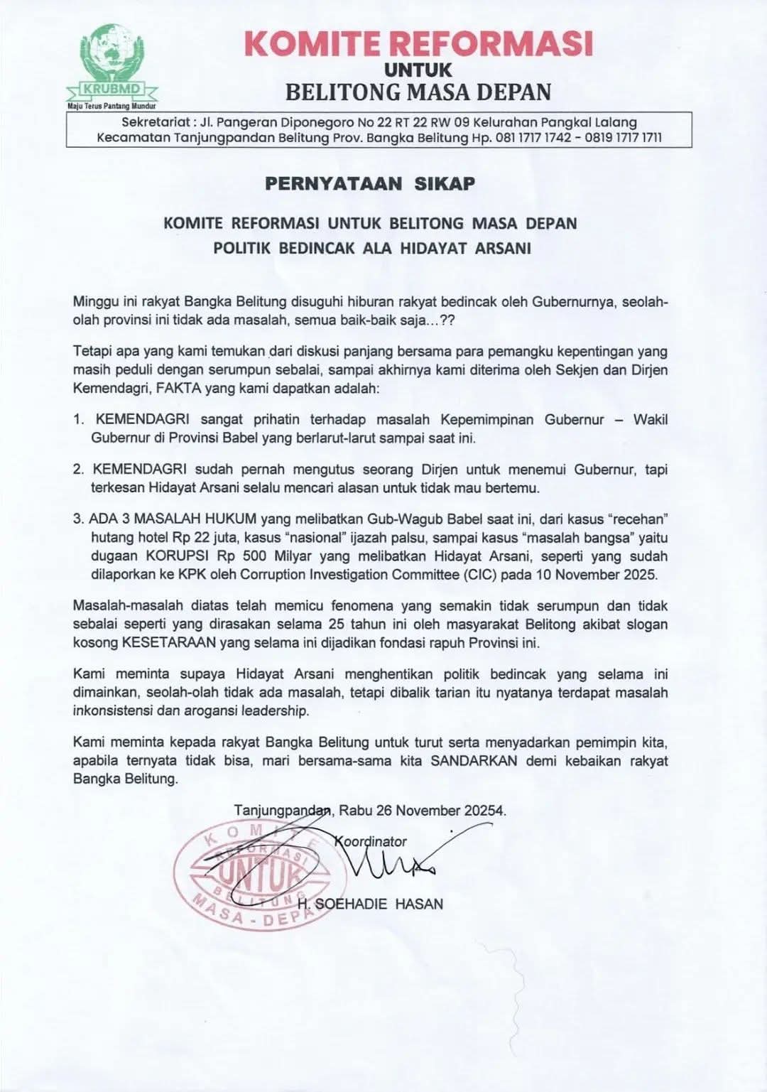 Sementara itu dalam rilis yang diterima redaksi, dikatakan bahwa Komite Reformasi Untuk Belitong Masa Depan menilai bahwa pihak Gubernur sedang melakukan serangkaian Politik Bedincak Ala Hidayat Arsani.